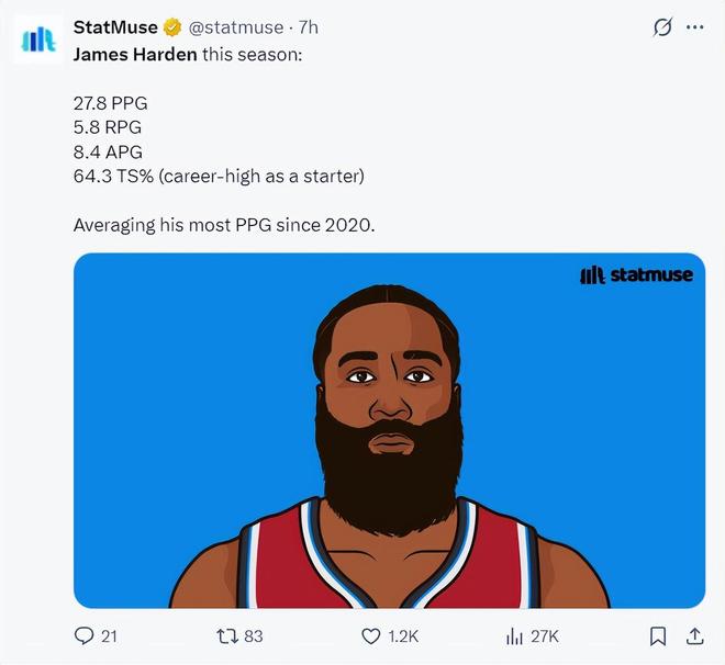 赛前数据媒体晒出哈登本赛季的数据,场均27.8分8.4助攻5.8篮板,真实命中率64.3%,得分是2020年火箭登后新高,真实命中率是生涯新高。