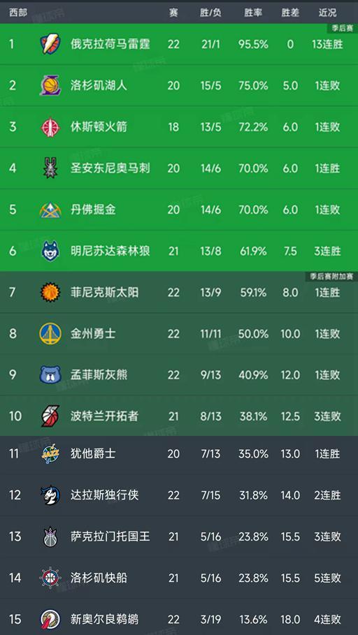 - 西部排名又变了:雷霆独孤求败,马刺冲到第4,快船排名第14